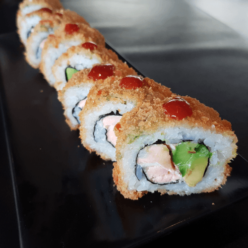 Een volledig gefrituurde sushi roll gevuld met krabstick, avocado en oranje viseitjes(Masago) afgewerkt met een sesamsaus