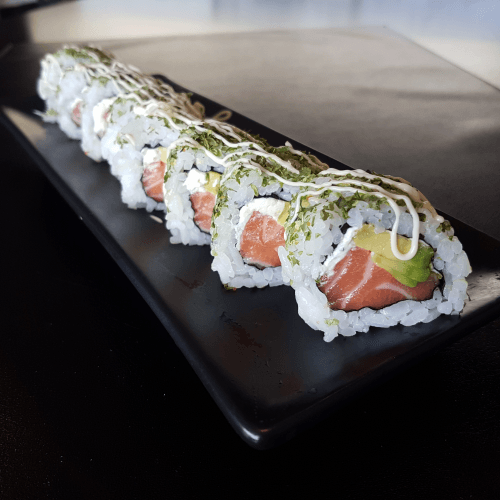 Een rol gevuld met crispy tempura en daarop geflambeerde zalm met kaas. Afgewerkt met mayonaise en teryaki saus en oranje masago