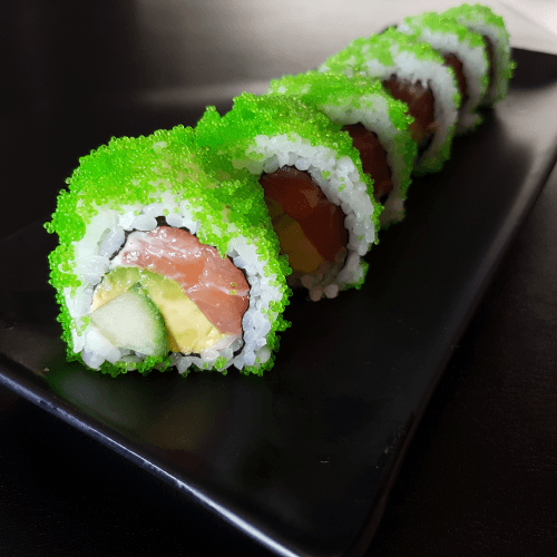 Rijkgevuld met verse zalm, avocado en komkommer omringd met verse groene wasabi viseitjes van de capelin
